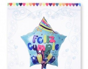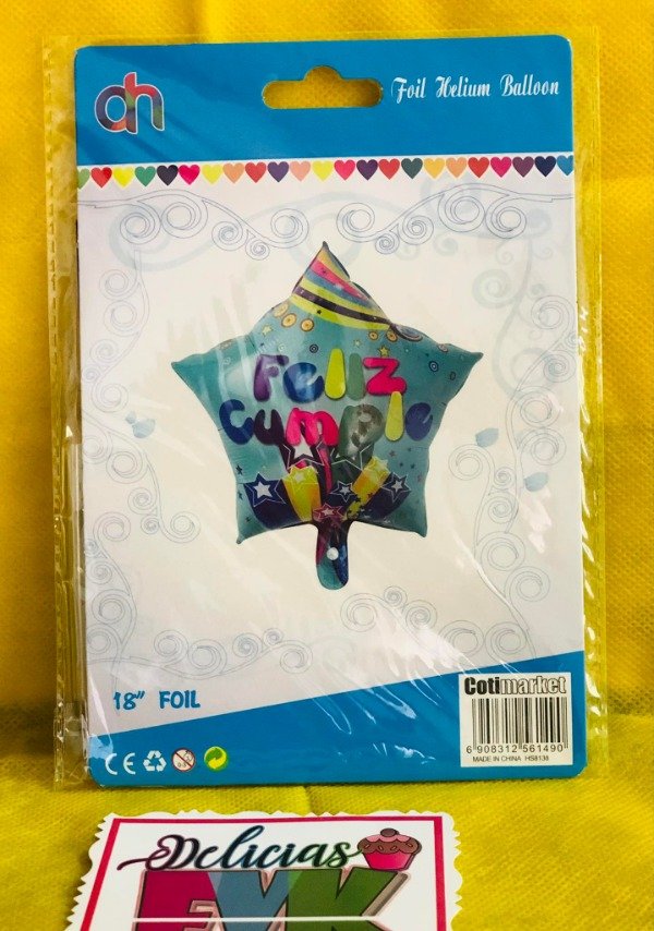 Globo de mylar -foil (papel metalizado) con forma de estrella con leyenda de feliz cumpleaños. Tamaño: 18 pulgadas / 45 cm. aprox. Se inflan con aire o con gas elio. Se utilizan en decoraciones de cumpleaños infantiles, de quince años, bodas, fiestas y todo tipo de eventos.