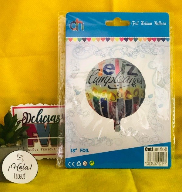 Globo de mylar -foil (papel metalizado) con forma de redonda con leyenda de feliz cumpleaños. Tamaño: 18 pulgadas / 45 cm. aprox. Se inflan con aire o con gas elio. Se utilizan en decoraciones de cumpleaños infantiles, de quince años, bodas, fiestas y todo tipo de eventos.