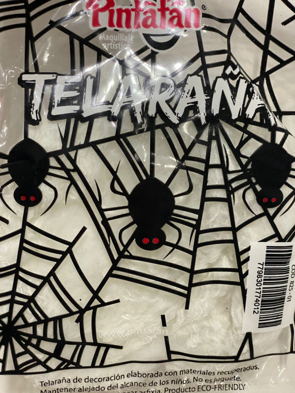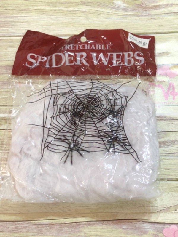 Telaraña de color blanco. Se utiliza como decoración para fiestas de Halloween, o tandas temáticas de terror.